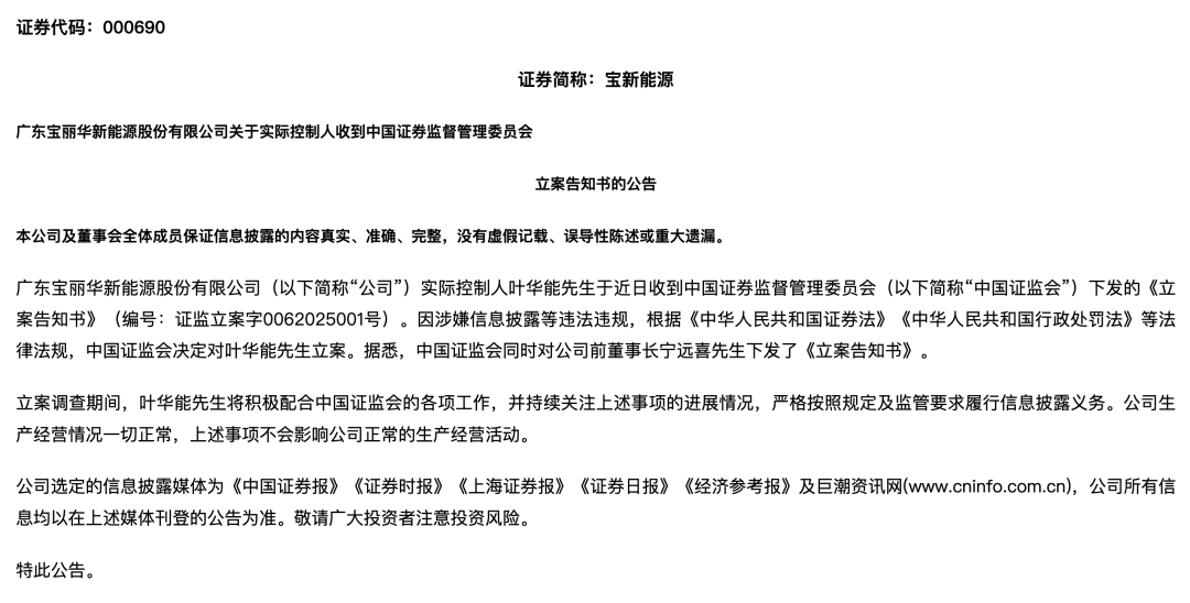 首先是披露“关于实际控制人叶华能收到中国证券监督管理委员会立案告知书的公告”,指出实际控制人叶华能于近日收到中国证监会立案告知书。因涉嫌信息披露等违法违规,中国证监会决定对叶华能立案。