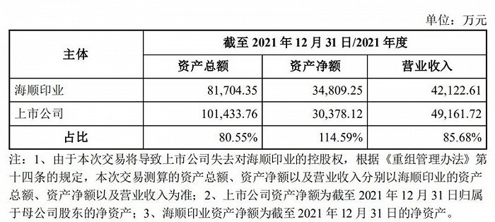 在剥离之前,海顺印业在上市公司滨海能源的合并报表中占据比较大的份量,其中,海顺印业总资产占比为80.55%,营业收入占比为85.68%。