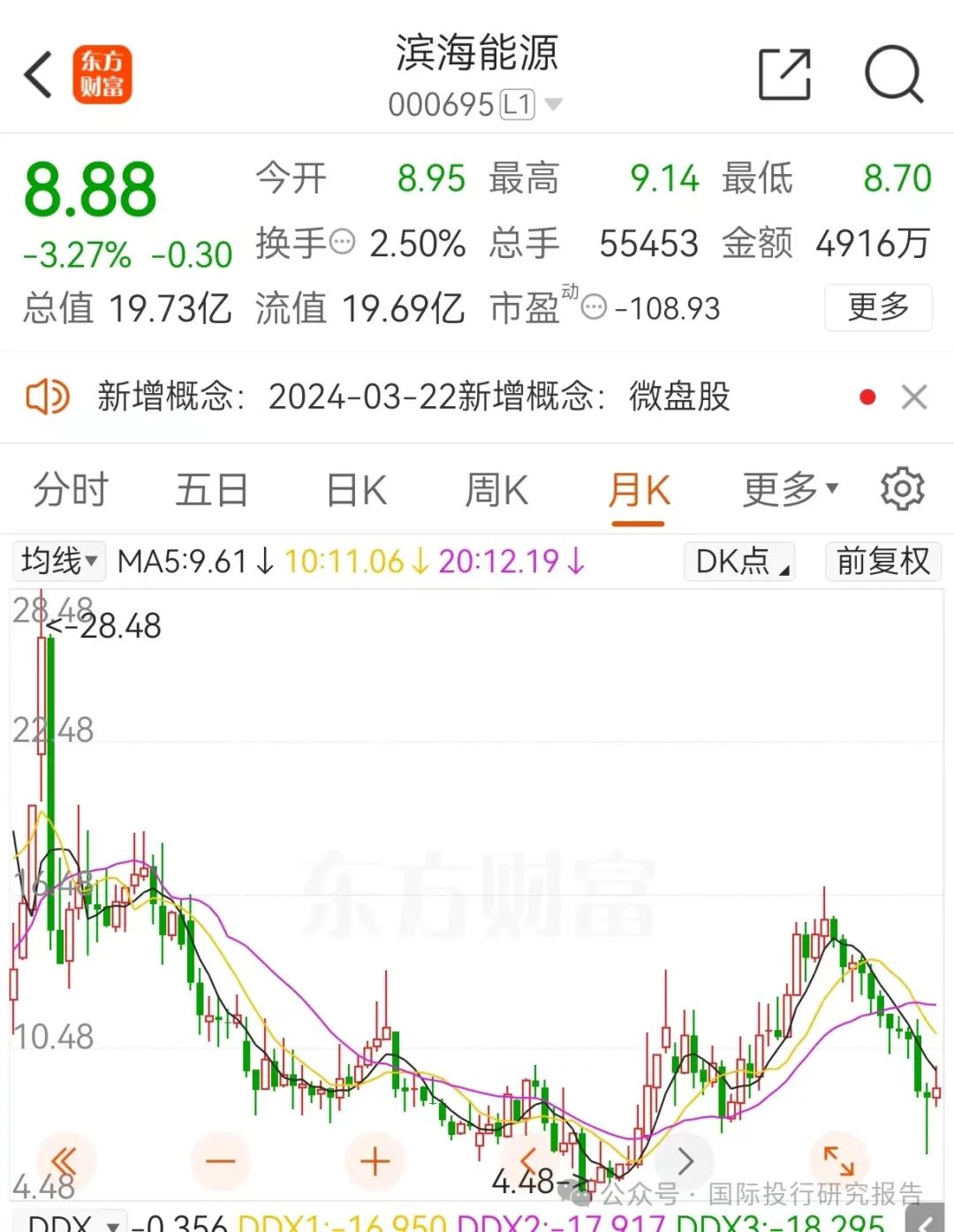6、话说回来,A股过去2年中很多时间段都是群魔乱舞,操纵小市值股票的庄家很多,而王选择了一个业绩很烂的滨海能源,不知道是出于什么信息来源和行业判断。应该是重组转型吧。最新的信息显示,滨海能源筹划近一年定增终止,然后又画了一个254亿投入光伏一体化大饼,靠概念大概是不行的了,王什么时候解套也知道。