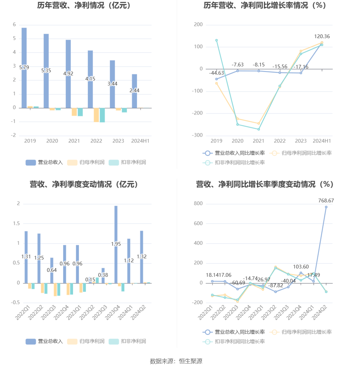 根据半年报,公司第二季度实现营业总收入1.32亿元,同比增长768.67%,环比增长17.31%;归母净利润218.31万元,同比下降86.23%,环比增长464.16%;扣非净利润167.42万元,同比下降88.18%,环比增长287.17%。