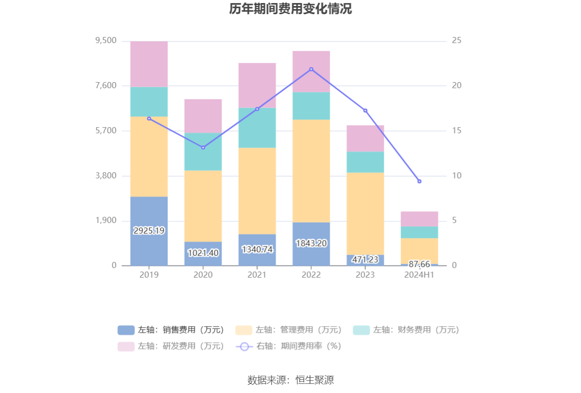 2024年上半年,公司期间费用为2298.59万元,较上年同期减少990.11万元;期间费用率为9.40%,较上年同期下降20.25个百分点。其中,销售费用同比下降77.4%,管理费用同比下降49.31%,研发费用同比增长71.47%,财务费用同比增长25.16%。