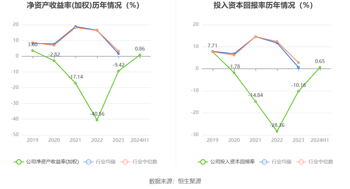 数据显示,2024年上半年公司加权平均净资产收益率为0.86%,较上年同期增长4.80个百分点;公司2024年上半年投入资本回报率为0.65%,较上年同期增长7.53个百分点。