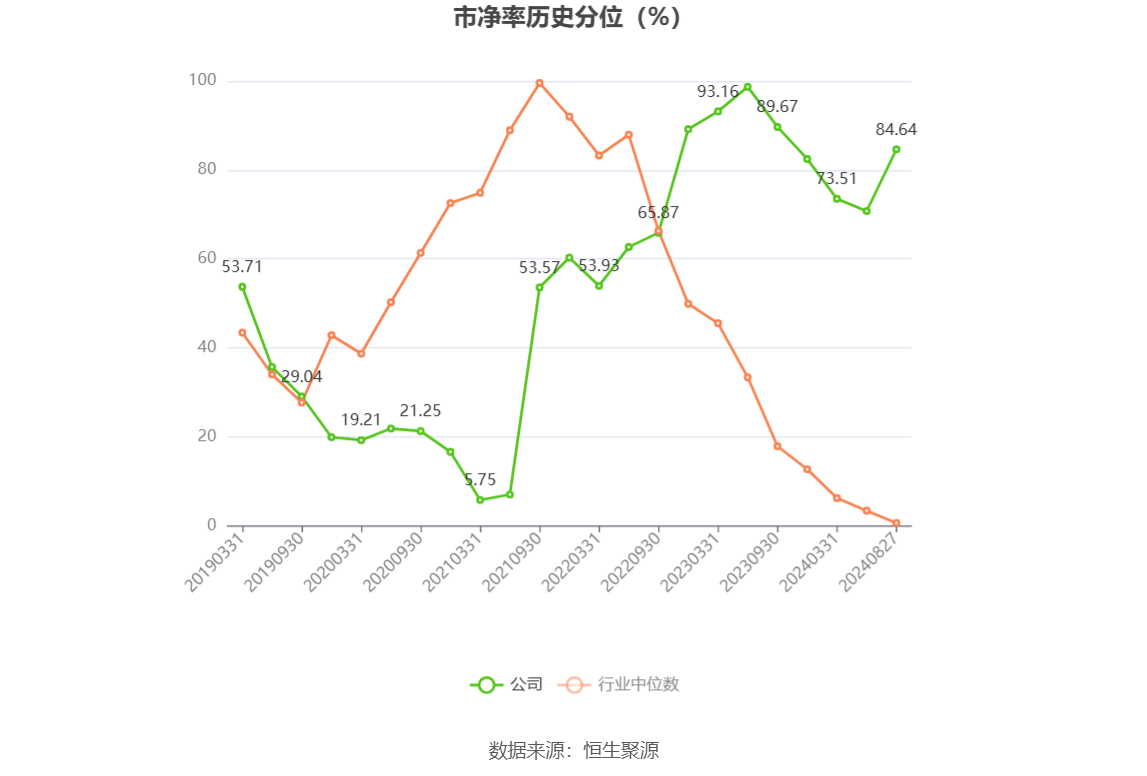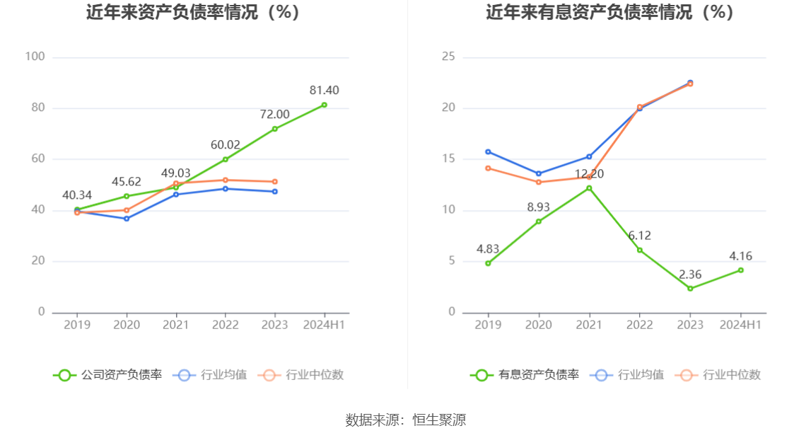 在偿债能力方面,公司2024年上半年末资产负债率为81.40%,相比上年末上升9.40个百分点;有息资产负债率为4.16%,相比上年末上升1.80个百分点。