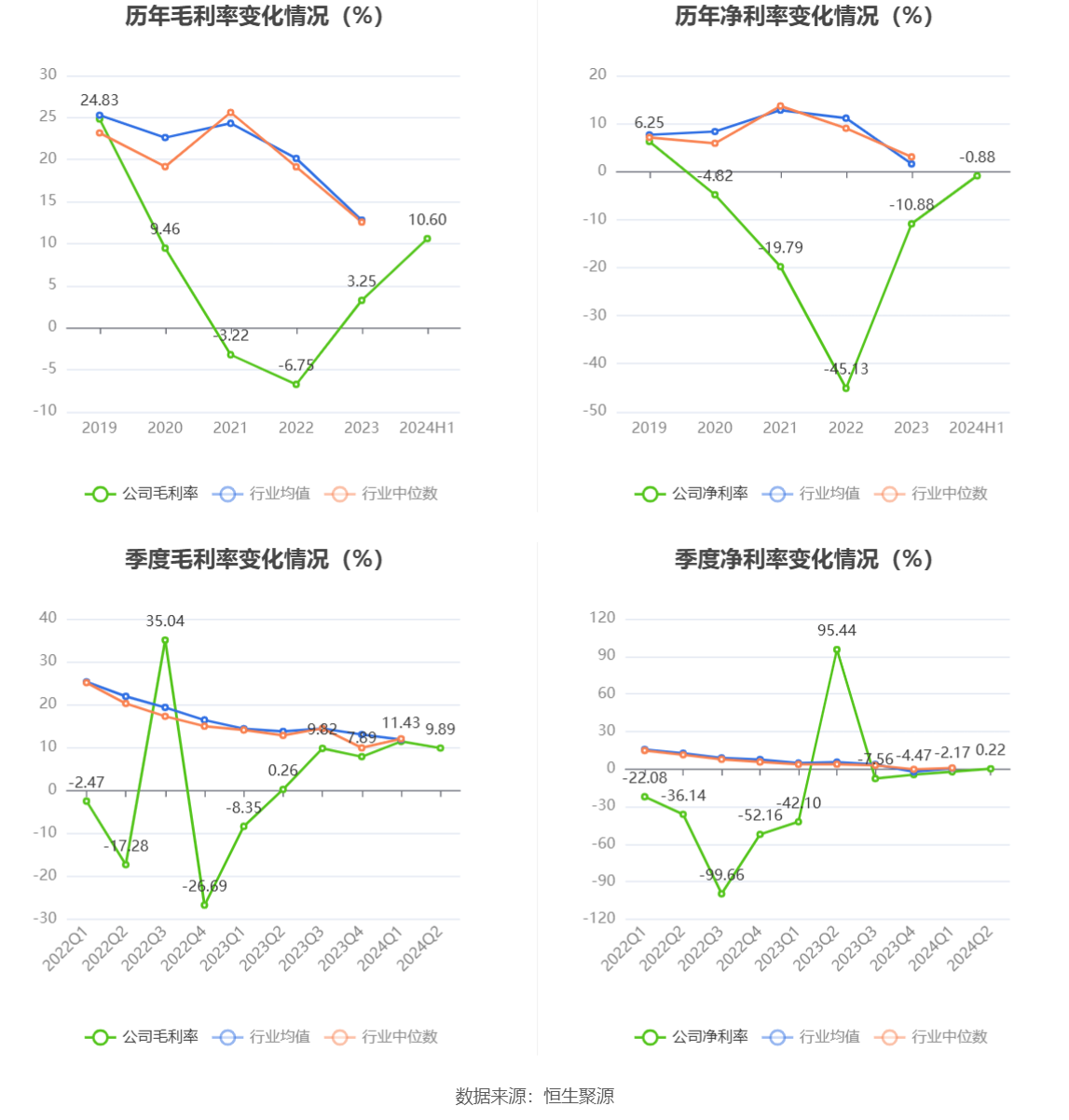 2024年上半年,公司毛利率为10.60%,同比上升17.77个百分点;净利率为-0.88%,较上年同期上升22.39个百分点。从单季度指标来看,2024年第二季度公司毛利率为9.89%,同比上升9.63个百分点,环比下降1.54个百分点;净利率为0.22%,较上年同期下降95.22个百分点,较上一季度上升2.39个百分点。