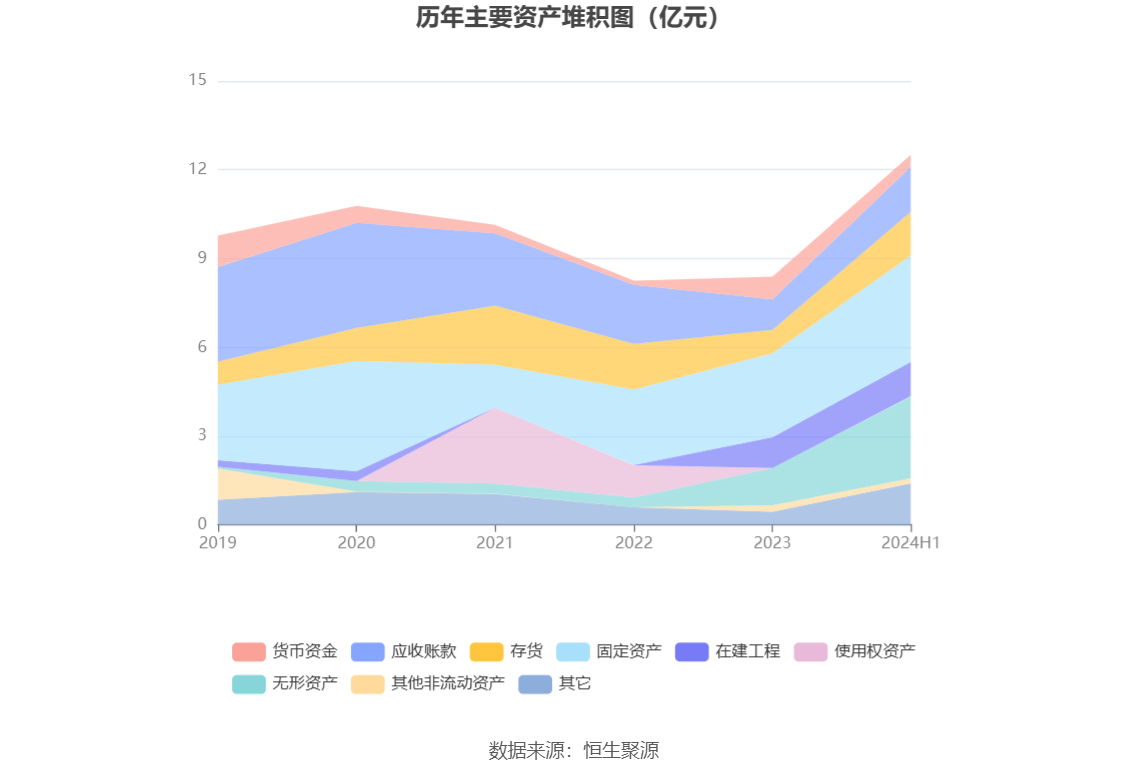 资产重大变化方面,截至2024年上半年末,公司无形资产较上年末增加120.13%,占公司总资产比重上升7.06个百分点;货币资金较上年末减少47.66%,占公司总资产比重下降5.96个百分点;固定资产较上年末增加26.81%,占公司总资产比重下降5.17个百分点;应收票据较上年末增加2515.52%,占公司总资产比重上升4.09个百分点。
