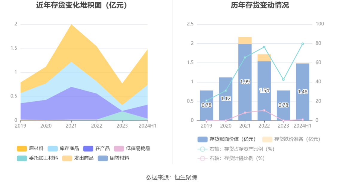 从存货变动来看,截至2024年上半年末,公司存货账面价值为1.48亿元,占净资产的79.74%。其中,存货跌价准备为139.33万元,计提比例为0.93%。