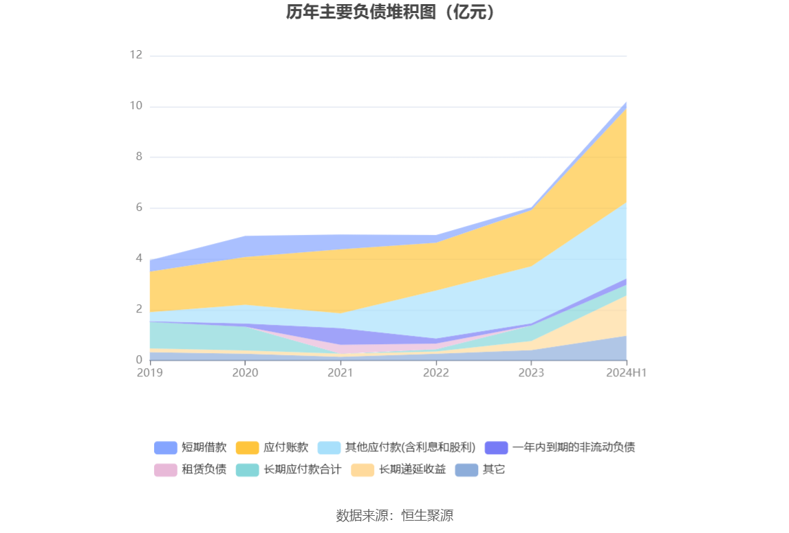 负债重大变化方面,截至2024年上半年末,公司应付账款较上年末增加67.56%,占公司总资产比重上升3.16个百分点;长期递延收益较上年末增加338.75%,占公司总资产比重上升8.34个百分点;其他应付款(含利息和股利)较上年末增加33.86%,占公司总资产比重下降2.82个百分点;其他流动负债较上年末增加1110.92%,占公司总资产比重上升2.66个百分点。