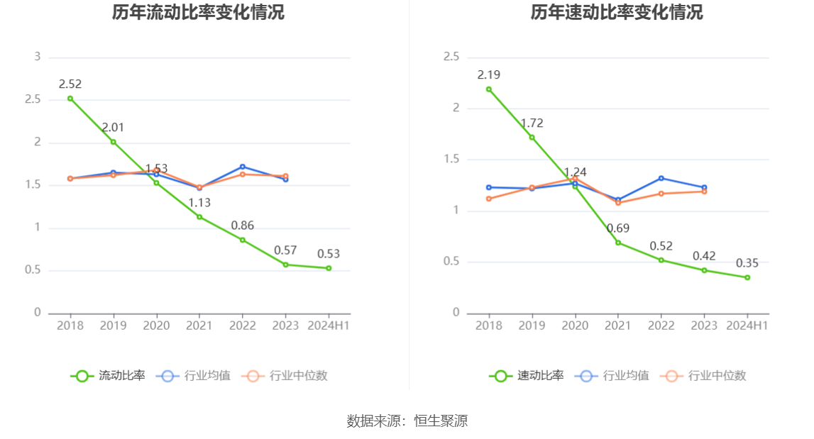 2024年上半年,公司流动比率为0.53,速动比率为0.35。