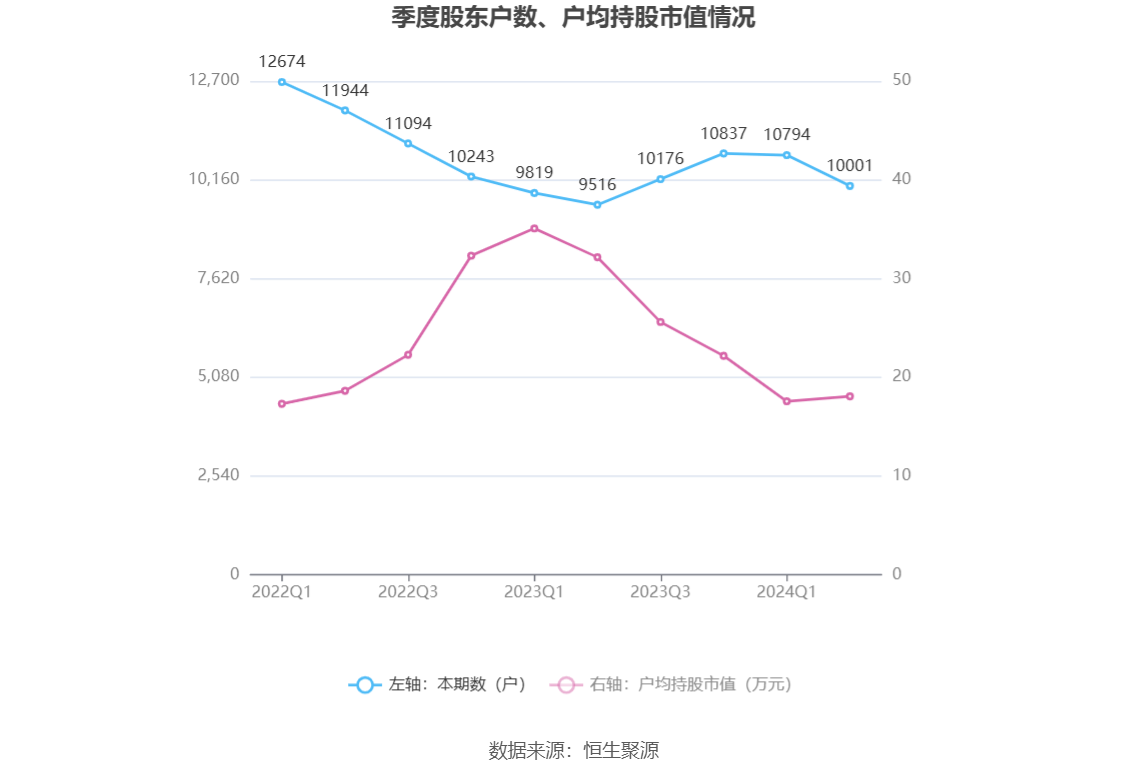 筹码集中度方面,截至2024年上半年末,公司股东总户数为1万户,较一季度末下降了793户,降幅7.35%;户均持股市值由一季度末的17.56万元上升至18.06万元,增幅为2.85%。