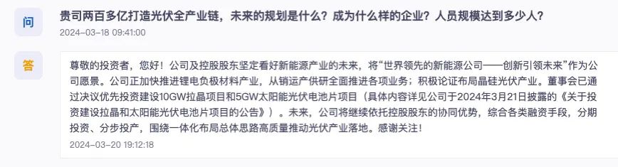 相关投资计划加重了市场担忧。有投资者在投资者互动平台提问:贵司两百多亿打造光伏全产业链,未来的规划是什么?成为什么样的企业?人员规模达到多少人?