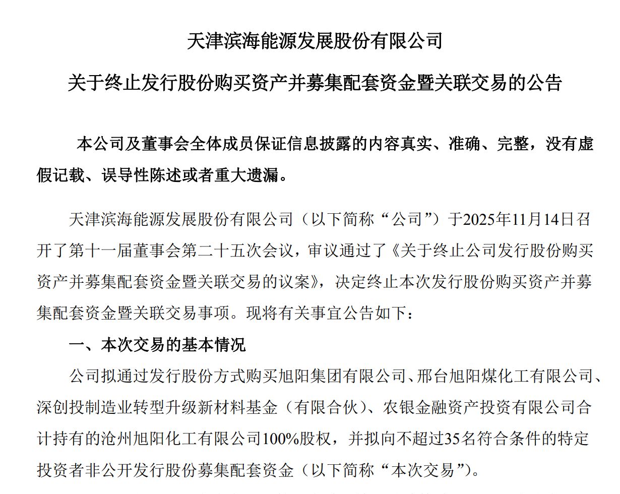 11月14日晚间,滨海能源公告称,公司董事会于当日审议通过了《关于终止公司发行股份购买资产并募集配套资金暨关联交易的议案》。