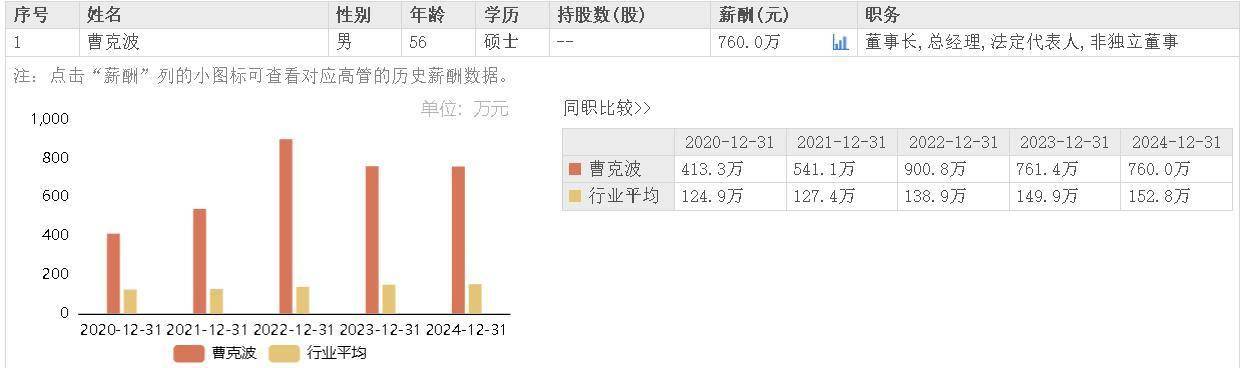 在高层管理人员薪酬方面,模塑科技的董事、监事和高级管理人员在2024年的报酬合计为2146.47万元。其中,董事长兼总经理曹克波以760万元的薪酬位列全公司最高。据公开资料显示,曹克波自1997年起担任公司高管,拥有丰富的行业经验和管理能力。他的父亲曹明芳则是公司的副董事长和总经理,两人共同领导着这家以汽车保险杠等零部件为主营业务的上市公司。
