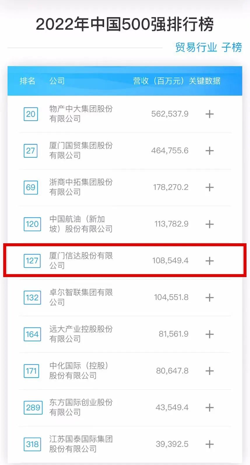 7月12日,财富中文网发布2022年《财富》中国500强榜单,厦门信达已连续13年进入该榜单。本次位居第127位,较去年前进19位,同时位列贸易子榜单第5位。