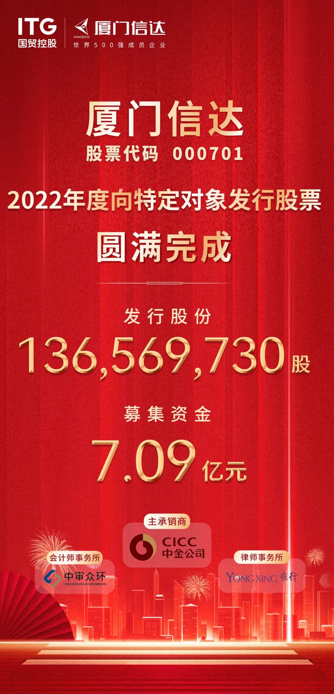 近日,厦门信达股份有限公司(以下简称“厦门信达”、“公司”)(证券代码:000701)对外发布《厦门信达股份有限公司向特定对象发行股票上市公告书》,标志着厦门信达2022年度再融资工作圆满完成。本次再融资向特定对象发行股票约1.27亿股,募集资金约7.09亿元,实现福建省内国资体系2023年A股再融资发行的“开门红”。