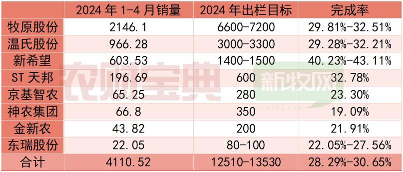 目前公布2024年生猪出栏目标的8家猪企中,1-4月合计销量达4110.52万头,计划出栏量高达1.25亿头至1.35亿头。截至目前,牧原股份、温氏股份、新希望和ST天邦的完成率已超30%。其中,完成度最高的是新希望,为40.23%-43.11%。事实上,新希望的完成率之所以如此之高,与之出栏目标较早期提出的2300-2500万头,整整下调了900-1000万头。