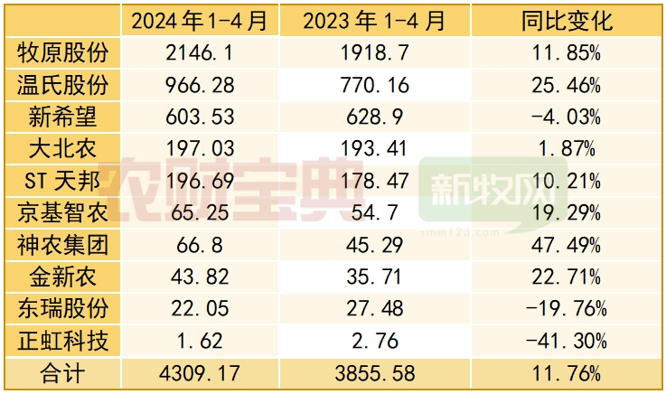 7家猪企前4月生猪销量同比增长,神农涨幅最高47.49%