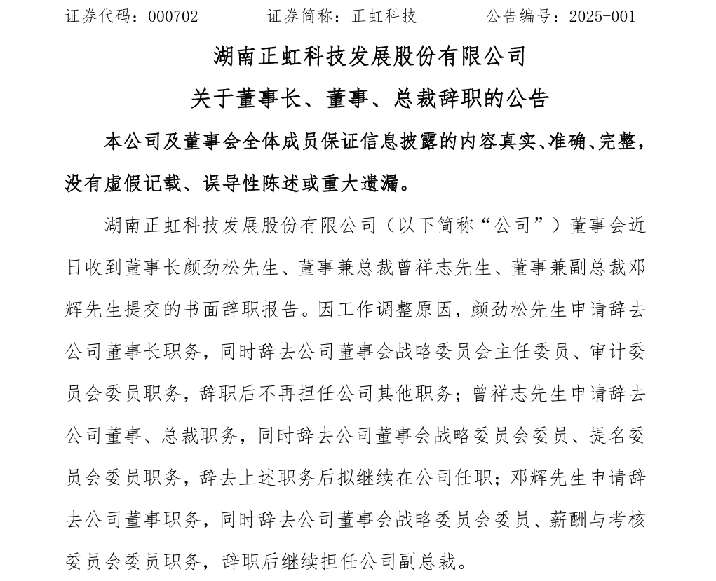 近日,湖南正虹科技发展股份有限公司(简称“正虹科技”)高层人事变动引发市场关注。1月3日晚间,正虹科技正式对外公告,其董事会收到了三位高层管理人员的书面辞职报告。