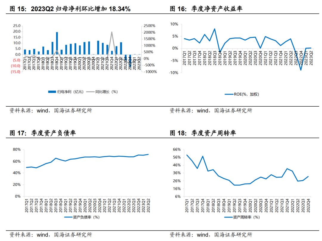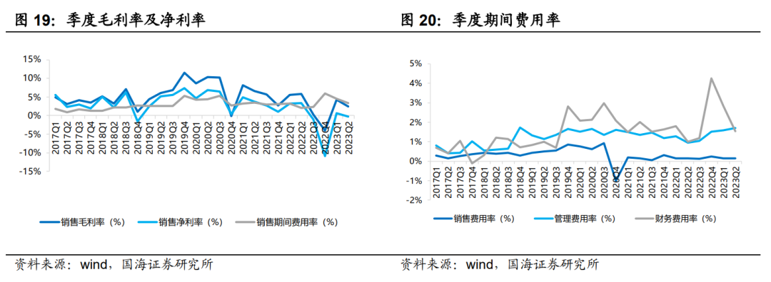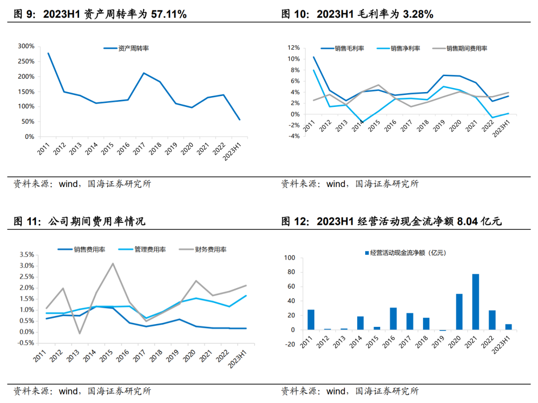 其中,2023 年 Q2 实现营收 359.35 亿元,同比-22.81%,环比+26.62%;实现归母净利润 0.41 亿元,同比-96.19%,环比+18.34%;ROE 为 0.17%,同比减少 3.79 个百分点,环比增加 0.03 个百分点。销售毛利率 2.52%,同比减少 3.29 个百分点,环比减少 1.72 个百分点;销售净利率-0.24%,同比减少 3.58 个百分点,环比减少 0.83 个百分点。