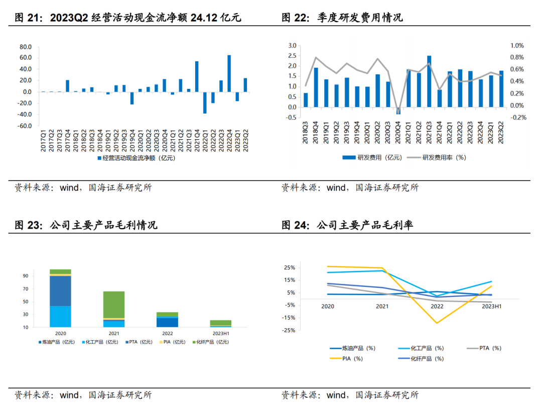 2023年二季度,公司实现归母净利润0.41亿元,同比-10.40亿元,环比+0.06亿元;其中毛利润达9.06亿元,环比-2.99亿元;管理费用4.33亿元,环比+1.42亿元,财务费用5.51亿元,环比-2.52亿元;所得税费用-1.71亿元,环比-0.45亿元。公司毛利润环比下滑,主要系二季度汽油、柴油裂解价差回落。据Wind,2023年二季度新加坡汽油裂解价差达14.96美元/桶,环比-7.07%,柴油裂解价差12.87美元/桶,环比-43.44%。管理费用增加主要系工厂实施技改;财务费用减少,或由于汇兑收益增加所致;所得税减少主要系上半年化纤板块业绩边际改善,针对前期可抵扣亏损计提确认递延所得税资产。期间费用率方面,2023Q2公司销售/管理/财务费用率分别为0.15%/1.21%/1.53%,同比+0.00/0.65/0.55pct,环比+0.03/+0.39/-0.70pct。展望下半年,文莱炼厂盈利能力有望增强。截至2023年8月21日,三季度新加坡汽油裂解平均价差达25.57美元/桶,环比+70.99%,柴油裂解价差则仍维持在31.00美元/桶的较高位。