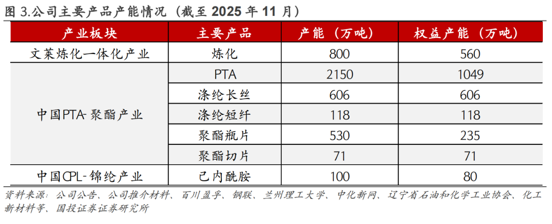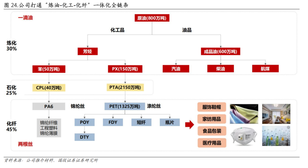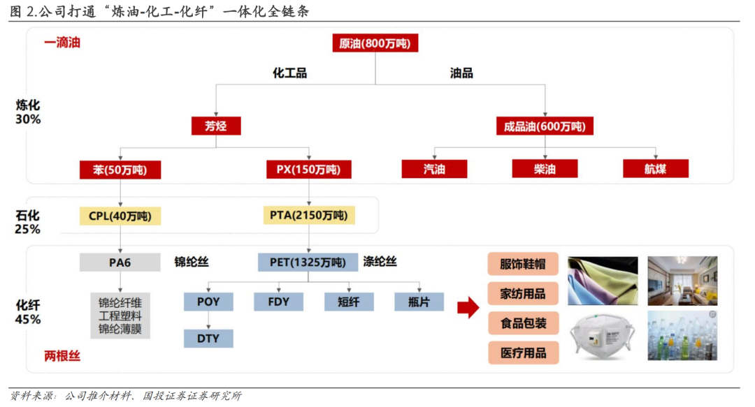 依托“文莱炼化基地-中国聚酯产业”的境内外协同联动优势,公司已形成上中下游垂直整合、各业务板块均衡发展的柱状产业布局。公司现有炼化产能800万吨、PTA产能2150万吨、聚合产能1325万吨,是全球颇具竞争力的化纤龙头企业之一。