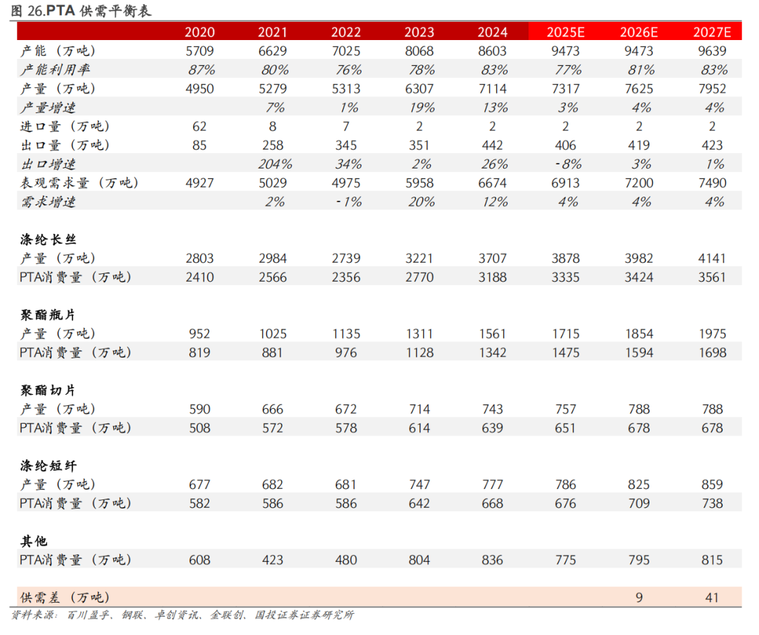 向后展望,供给端,PTA扩产节奏将显著放缓,根据钢联,2026-2027年PTA规划新增产能200万吨,结合产能拟投放时间及行业历史开工水平,我们预计2026、2027年行业产量分别为7625、7952万吨,同比增速分别为+4%、+4%。需求端,下游涤纶长丝、聚酯瓶片、聚酯切片、涤纶短纤等新产能规划对PTA需求产生拉动,另一方面,印度BIS认证取消背景下出口也有望同比向上。我们预计2026、2027年行业表需增速分别为+4%、+4%,出口增速分别为+3%、+1%。整体看,PTA虽仍处于产能过剩的阶段,但行业拐点已经出现,供需格局预期边际向好,叠加“反内卷”推进,产品盈利有望修复。