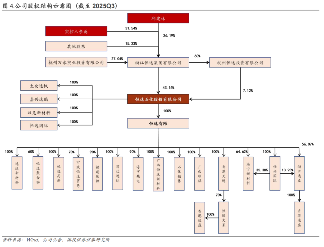 恒逸集团为公司控股股东,邱建林为公司实控人。截至2025Q3,恒逸集团直接持有公司43.16%的股权,并通过杭州恒逸投资有限公司间接持有7.12%的股权,合计控制公司50.28%的股权,为公司控股股东。邱建林持有恒逸集团26.19%的股权,并通过家族成员一致行动人(万永实业、邱祥娟、邱奕博、邱利荣、邱杏娟等)实际控制恒逸集团84.77%的股权,为上市公司实际控制人。