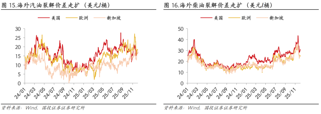 全球成品油裂解价差飙升。因地缘因素影响,部分地区炼油产能减少,推动全球范围内成品油裂解价差快速走强,截至11月18日,美国、欧洲、新加坡汽油裂解价差分别为19.4、22.4、15.0美元/桶,较年初+81%、+149%、+113%;柴油裂解价差分别为43.6、35.5、31.9美元/桶,较年初+118%、+130%、+95%。