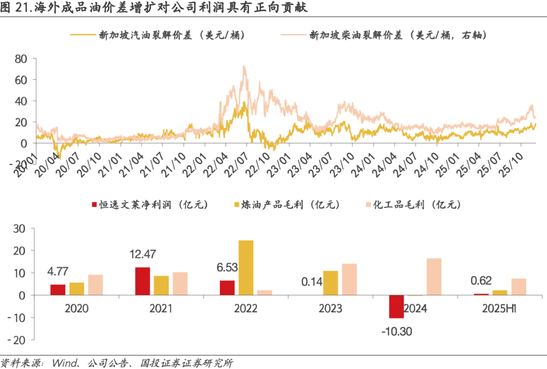 公司文莱炼厂直接受益于本轮海外裂解价差走扩。公司文莱炼化项目地处大摩拉岛,由公司和文莱政府合资建设(其中公司持股70%,文莱政府持股30%),是迄今为止文莱最大的实业投资项目和中国民营企业最大的海外炼化项目。公司文莱炼厂具备原油加工能800万吨,主要产品包括汽油100万吨、柴油360万吨、化工轻油100万吨、PX150万吨、纯苯50万吨等。伴随海外裂解价差走扩,公司炼油板块盈利有望持续修复。