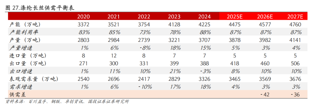 ②涤纶长丝:供给端,涤纶长丝产能投放高峰已过,未来扩产趋于合理,新增产能主要集中在桐昆股份、新凤鸣等大厂。根据百川盈孚,2026-2027年涤纶长丝规划新增产能285万吨,结合产能拟投放时间及行业历史开工水平,我们预计2026、2027年行业产量分别为3982、4141万吨,同比增速分别为+3%、+4%。需求端,内需有望在促消费政策刺激下逐步回暖,外需有望在美联储进入降息周期、印度取消BIS认证等因素提振下保持较快增长。我们预计2026、2027年行业表需增速分别为+3%、+3%,出口增速分别为+10%、+10%。整体看,预计2026-2027年涤纶长丝供需格局保持相对平衡。此背景下,涤纶长丝行业有望继续通过良好的行业协同,维持产品合理盈利空间。