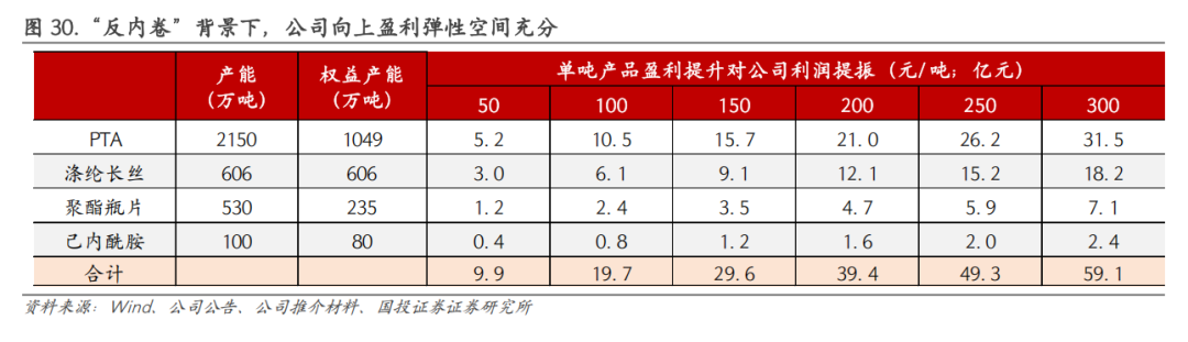 庞大产能基数效应下,看好公司向上盈利弹性。公司目前拥有PTA、涤纶长丝、聚酯瓶片、己内酰胺权益年产能分别为1049万吨、606万吨、235万吨、80万吨,伴随各产品“反内卷”进程推进,看好公司向上盈利弹性空间。