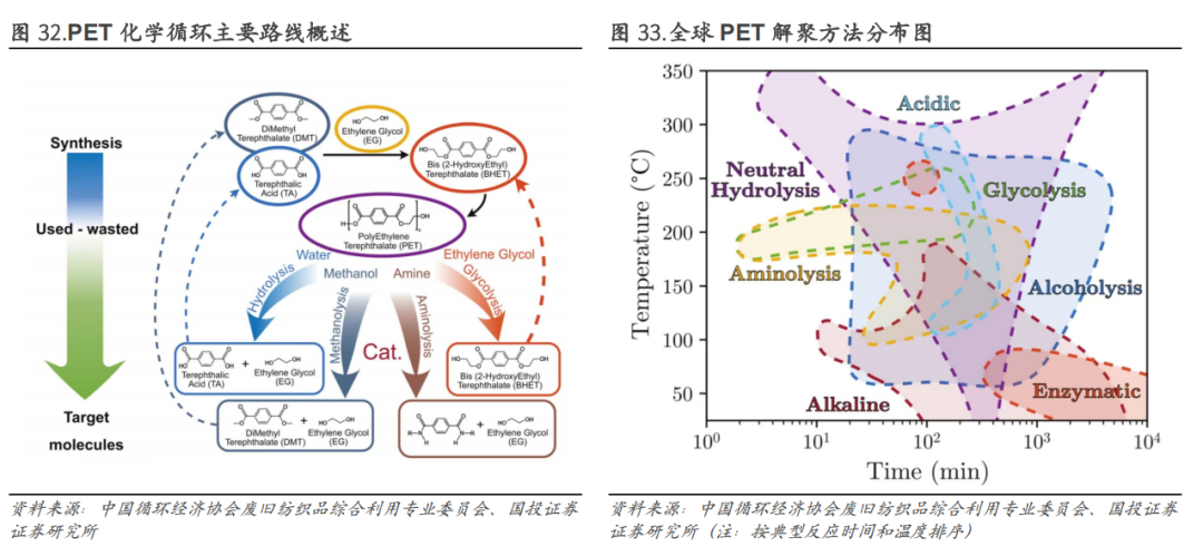 全球废旧聚酯纺织物回收率低,市场潜力空间大。全球每年生产超过1亿吨聚酯纺织品,其中大部分在服装、家居和产业用纺织品中短时间使用后便进入废弃流程。由于纺织品多元的复杂结构,目前废旧纺织物的回收率仍然极低。然而,这些纺织品中的聚对苯二甲酸乙二醇酯(PET)是一种高价值聚合物,其回收利用潜力巨大。据废旧纺织品综合利用,全球可用于化学回收的聚酯纺织废料市场规模将在2030年突破500亿美元。在政策层面上,中国、欧盟和美国等均出台法规支持“化学循环再生”项目的产业化。