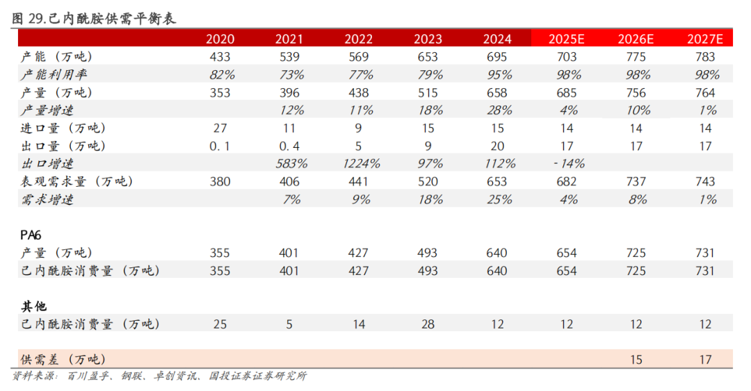 ④己内酰胺:供给端,根据百川盈孚,2026-2027年己内酰胺行业规划新增产能70万吨,结合产能拟投放时间及行业历史开工水平,我们预计2026、2027年行业产量分别为756、764万吨,同比增速分别为+10%、+1%。需求端,下游PA6的新增产能投放将带动原料需求,我们预计2026、2027年行业表需增速分别为+8%、+1%。整体看,行业供需格局有望保持紧平衡,此背景下,行业通过协同减产、提价等措施的效果有望逐步显现,预计产品盈利将迎来修复。
