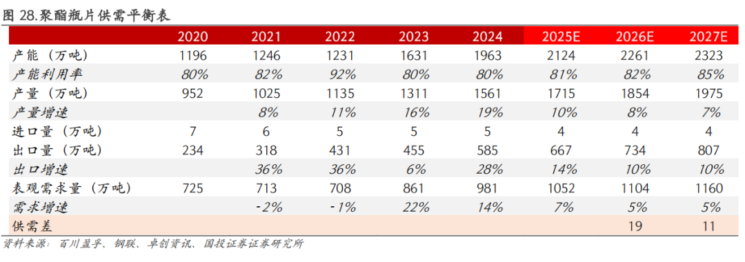 向后展望,供给端,瓶片产能投放进入尾声,根据百川盈孚,2026-2027年瓶片规划新增产能130万吨,结合产能拟投放时间及行业历史开工水平,我们预计2026、2027年行业产量分别为1854、1975万吨,同比增速分别为+8%、+7%。需求端,生鲜、奶茶等片材消费持续快速增长,为瓶片需求提供支撑;同时,受益于海外部分产能退出及中国瓶片产能扩张带来的竞争优势,出口有望继续保持高速增长,我们预计2026、2027年行业表需增速分别为+5%、+5%,出口增速分别为+10%、+10%。整体看,虽然瓶片行业供需矛盾短期内难以彻底缓解,但随着行业扩产节奏放缓和下游需求稳步提升,供需格局有望逐步改善。此前行业自律已对盈利修复起到积极作用,未来行业有望继续通过供给侧协同,推动盈利水平进一步改善。