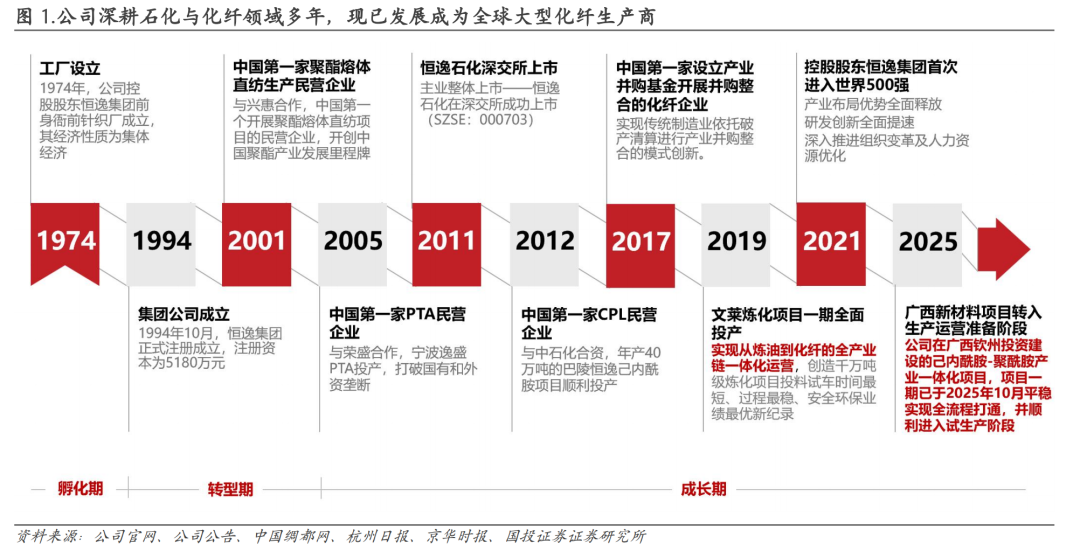 1974年公司前身萧山县衙前公社针织厂成立,1994年浙江恒逸集团有限公司正式组建,2011年集团控股企业恒逸石化通过资产重组在深交所上市。成立以来,公司逐步剥离纺织印染业务,聚焦发展化纤和聚酯产业,并逐步向上游延伸,通过出海布局文莱炼化项目和携手荣盛投建PTA产能,打通从原油加工到化纤产品的全产业链闭环,构建起中国独有的“涤纶+锦纶”双主业驱动模式。