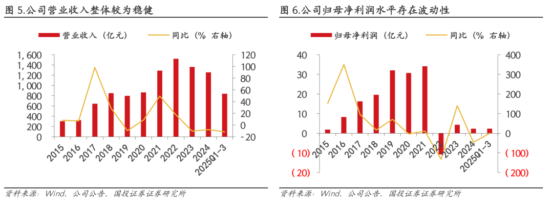 营业收入保持稳健,业绩逐步回暖向好。收入端,2023年来受油价震荡下行影响有所下滑,但整体仍较为稳健,维持在千亿规模以上。利润端,存在较大的波动性,文莱炼厂投产后公司盈利大幅提升,随后受聚酯行业扩产竞争加剧、油价下行及终端疲软等因素影响出现下滑,经营承压。2025年前三季度,公司实现营业收入838.85亿元,同比-11.5%;实现归母净利润2.31亿元,同比+0.1%,逐步企稳。