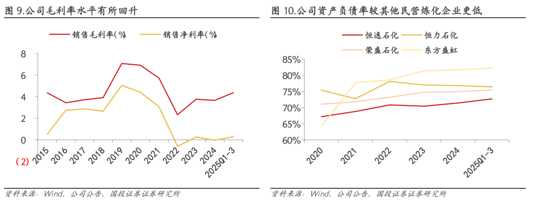 毛利率水平有所回升,资产负债率同业较优。盈利能力方面,2025年前三季度公司毛利率和净利率分别为4.4%和0.3%,同比+0.3pct、-0.1pct,毛利率水平有所回升,或系海外裂解价差走扩及部分产品“反内卷”推进所致。资产结构方面,2025年前三季度公司资产负债率72.7%,与国内其他民营炼化企业相比,处于较低水平。