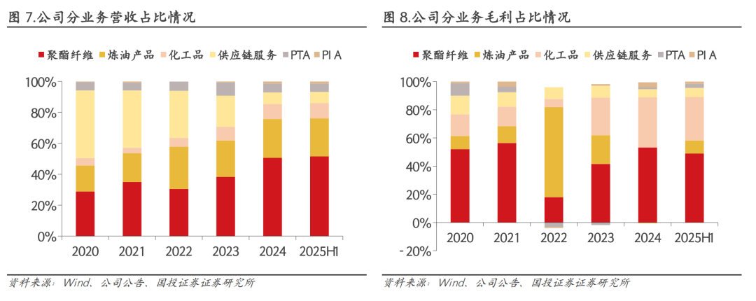聚酯纤维是公司主要的营收和毛利来源。2025年上半年,聚酯纤维板块实现营收288.47亿元,占公司总营收的52%;实现毛利11.83亿元,占公司总毛利的49%。