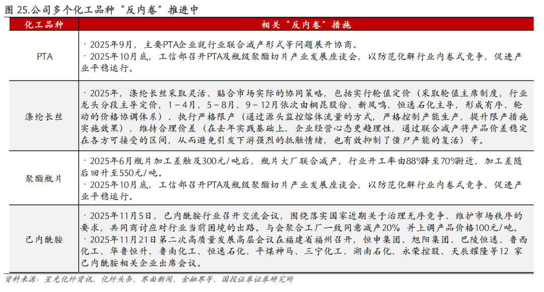 公司多品种“反内卷”进行中,行业格局有望得到优化。公司PTA、涤纶长丝、聚酯瓶片、己内酰胺等多个品种“反内卷”推进中,未来伴随行业政策及具体措施的逐步落地,行业格局有望得到优化,产品盈利有望迎来改善。