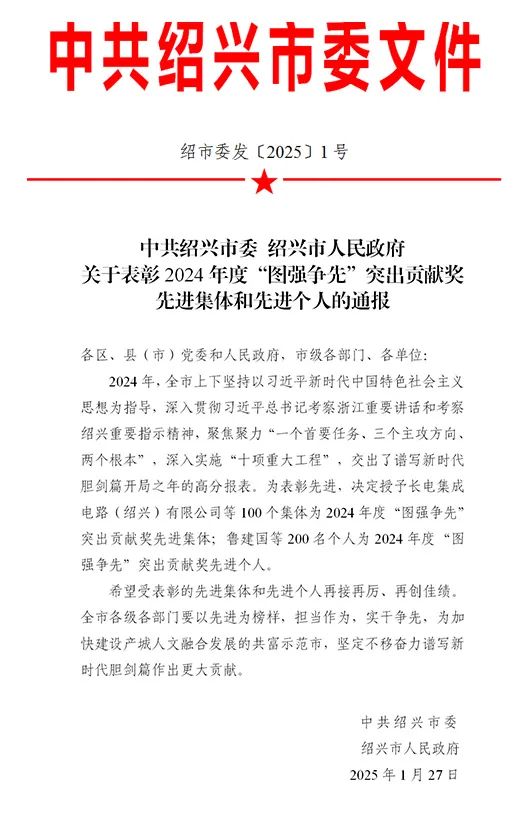 新年伊始,开门迎喜。近日,中共绍兴市委、绍兴市人民政府发布《关于表彰2024年度“图强争先”突出贡献奖先进集体和先进个人的通报》,浙江震元股份有限公司荣获“创新突破领域”先进集体,下属浙江震元生物科技有限公司荣获“人才科技金融领域”先进集体,公司副总经理王浩同志荣获“经济建设领域”先进个人。