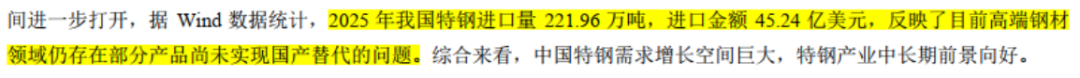 当然,中信特钢也表示2025年我国特钢进口量221.96万吨,自己在国产替代领域还有很多事要做。