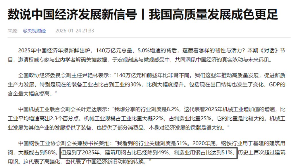从需求结构看,国内钢铁需求的重心正从传统的建筑领域,向汽车、机械、船舶、新能源等高端制造业领域转移,2025年,制造业用钢占比达到51%,首次超越建筑用钢的49%。