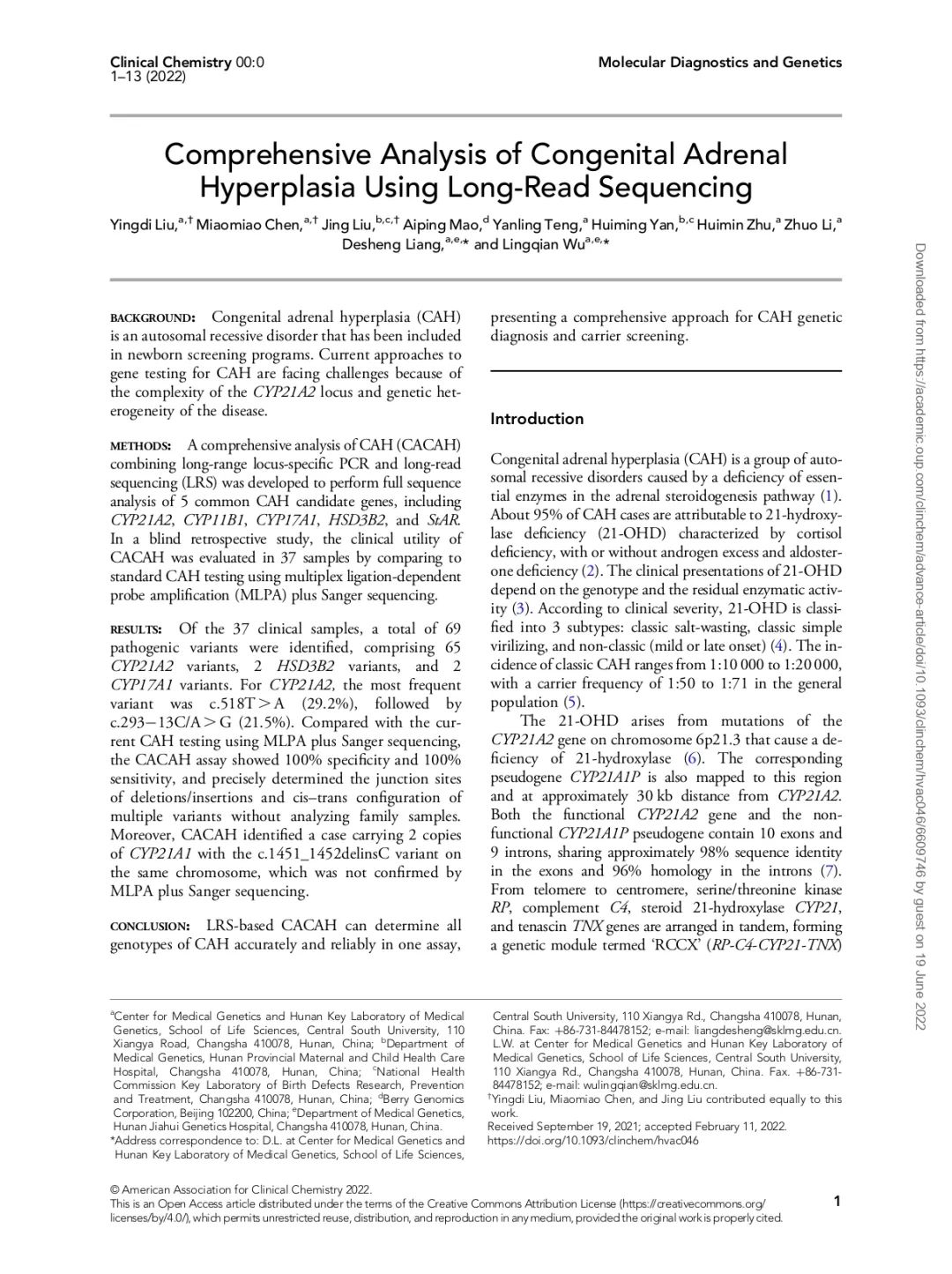 近日,由贝瑞基因提供技术支持的三代CAH(先天性肾上腺皮质增生症)临床回顾性研究成果在检验医学领域权威国际学术期刊Clinical Chemistry(即时IF=11.784)上发表,这是运用分子诊断技术探索CAH分子机制的一次创新。该研究证明贝瑞基因三代CAH检测技术与传统MLPA+Sanger+家系组合分析方法或生化分析方法相比,筛查更全面,检测更准确。