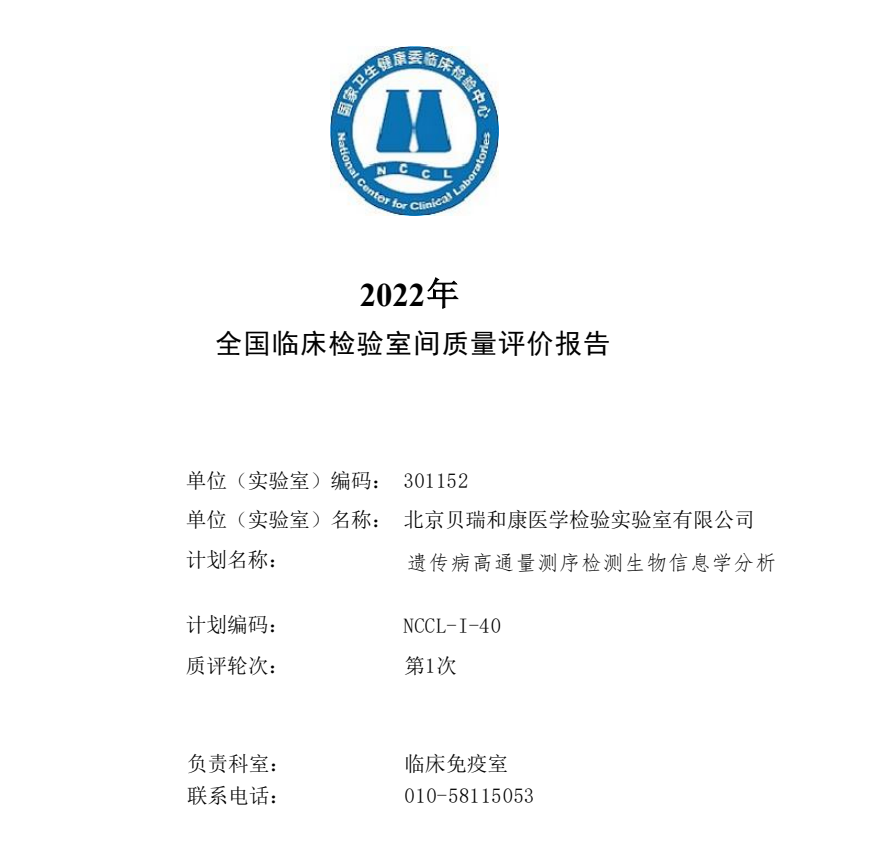 近日,国家卫生健康委临床检验中心(NCCL)发布了2022年遗传病高通量测序检测生物信息学分析室间质量评价统计结果,北京贝瑞和康医学检验实验室以满分通过考核,展示了过硬的生信分析能力及自主创新能力。