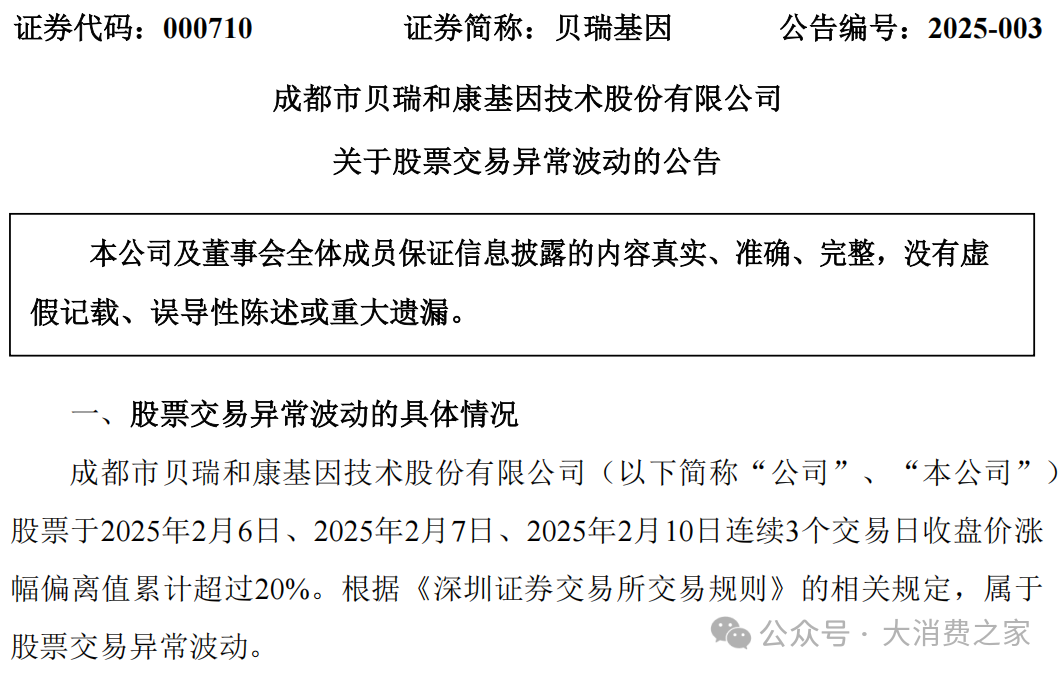 2月11日开盘,贝瑞基因(000710.SZ)直接封停。此前在2月6日、7日和10日,贝瑞基因的股票连续三个交易日收盘价涨幅偏离值累计超过20%。其中,2月7日和10日均以涨停价收盘,这一表现引起了市场的广泛关注。