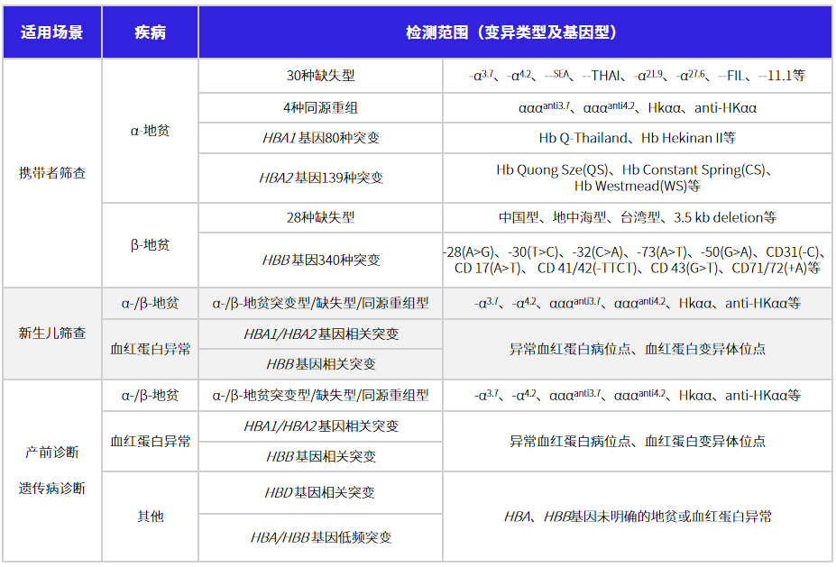 一次性实现α、β地贫相关致病性SNV、Indel、缺失型变异、三联体、四联体及融合基因的全面覆盖。精准检测额外增加HBD基因覆盖,为临床分析各血液学指标异常提供全面的基因型信息。