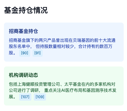 招商基金旗下的两只产品曾出现在贝瑞基因的前十大流通股东名单中,但持股数量相对较少,合计持有约数百万股,占公司总股本的比例较低。