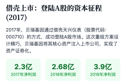 2017年,公司通过借壳天兴仪表(股票代码:000710)的方式,成功登陆A股市场,完成了从一家非公众公司到上市公司的华丽转身。这次重组方案设计精巧,贝瑞基因将其核心资产注入上市公司,实现了资产证券化,同时也为公司的后续发展募集了宝贵的资金。上市后的业绩承诺与兑现情况