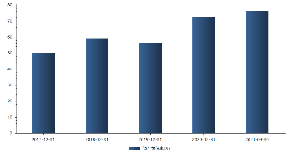 除此之外,公司的资产负债率也居高不下。同样是2019年,公司的资产负债率从56.48%上涨至2020年的72.66%。截至2021年9月30日,公司的总负债为73.94亿,资产负债率高达76.23%。这意味着有7成的资产是公司从外部借来的,资金和财务风险较高。