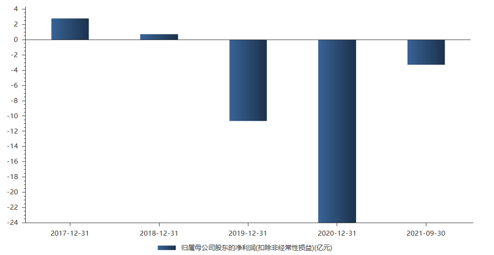 然而相较于节节高升的股价,公司的业绩却不太理想。从近五年的财报来看,公司自2019年起营收开始呈下滑趋势,连续两年的扣非后净利润为亏损状态。2021年前三季度,公司实现营收6.05亿,扣非后的净利润为-3.26亿元,较上期亏损速度有所放缓。