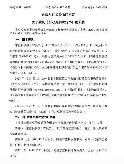 *ST京蓝在公告中称,2023年11月21日,公司收到中国证券监督管理委员会黑龙江监管局(以下简称“黑龙江证监局”)下发的《行政处罚决定书》〔2023〕5号。